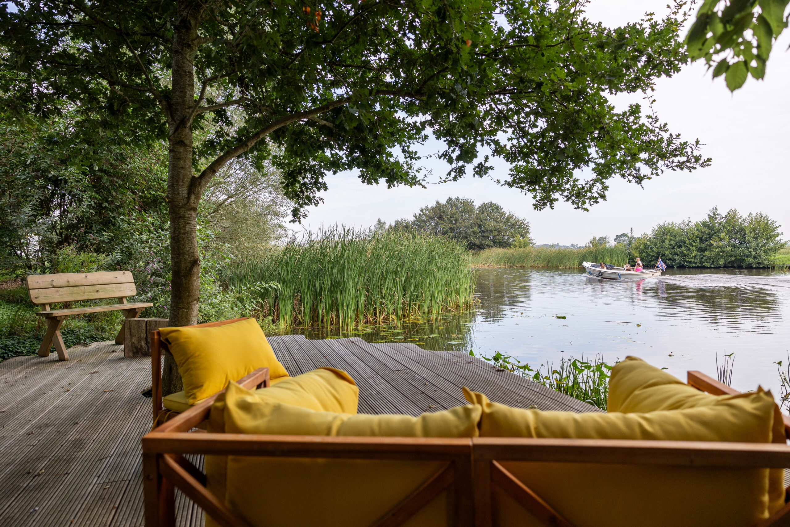 Een charmant mini-bos, een grote tuin en fijne zitjes aan het water maken het een plek om helemaal op te laden.
